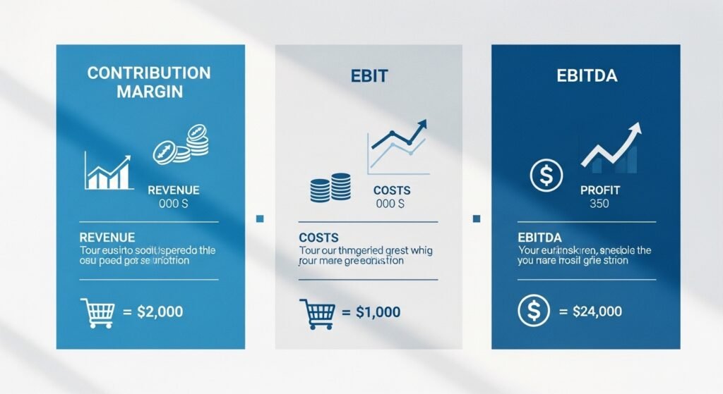 Each number gives a different view of financial health. The contribution margin helps you zoom in on each product’s performance, while EBIT and EBITDA show the company’s overall health.